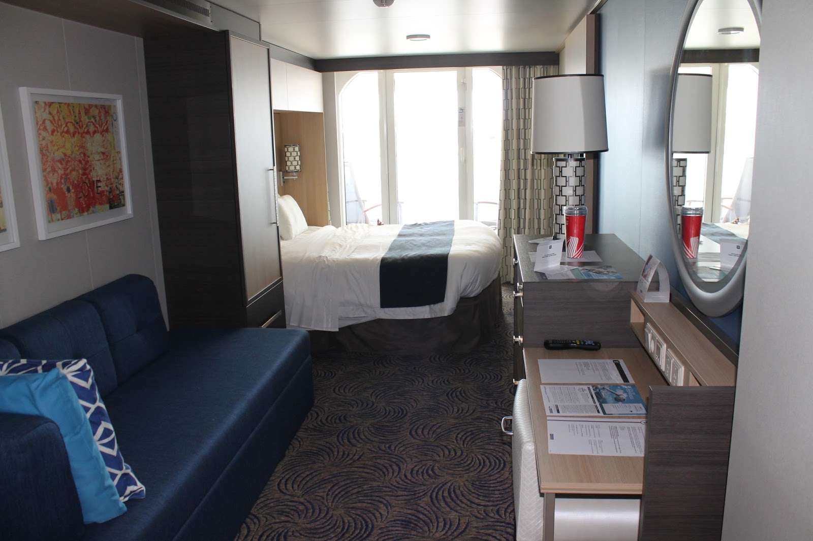 So when I book a cruise I always pick a specific cabin . . . I research a lot and make sure there is nothing noisy above or below . . . I can't say always anymore because this time I went with a guaranteed balcony cabin to be assigned by Royal Caribbean . . . never ever again! Why? Our cabins was on Deck 13 and on Deck 14 right above us was the pool. I am crossing my fingers it is a low traffic area and that the noise doesn't bother us but since I said never and am writing this after the fact you can guess it did not go so well! While it was nice to save $200, never again! Anyway, our room was beautiful and the nicest room we have ever had. This ship isn't that old so the color and design is new and hip compared to some of the older boats we have been on. So it took us two hours to get on board, but the cabin was ready for us to enjoy!
